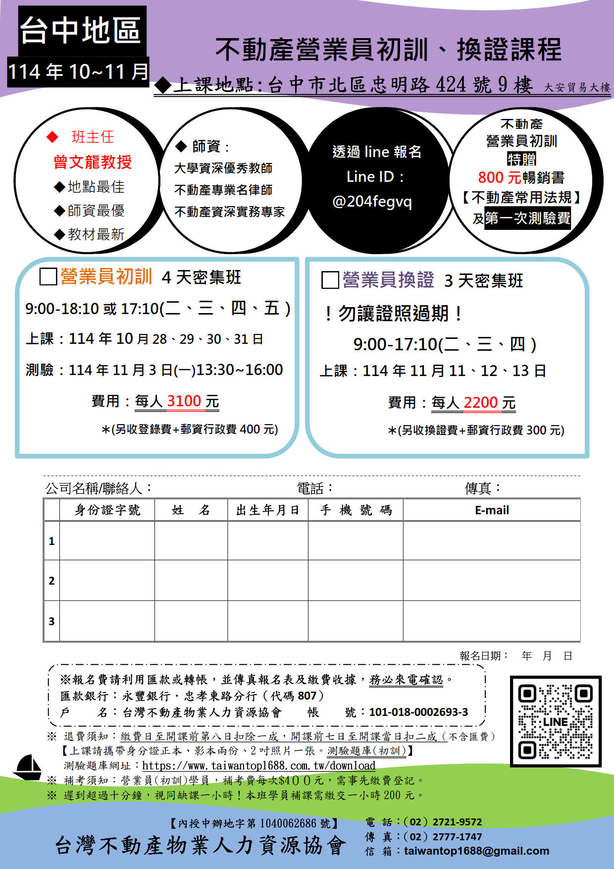 【台中區】不動產營業員《換證》 114年11月11~13日