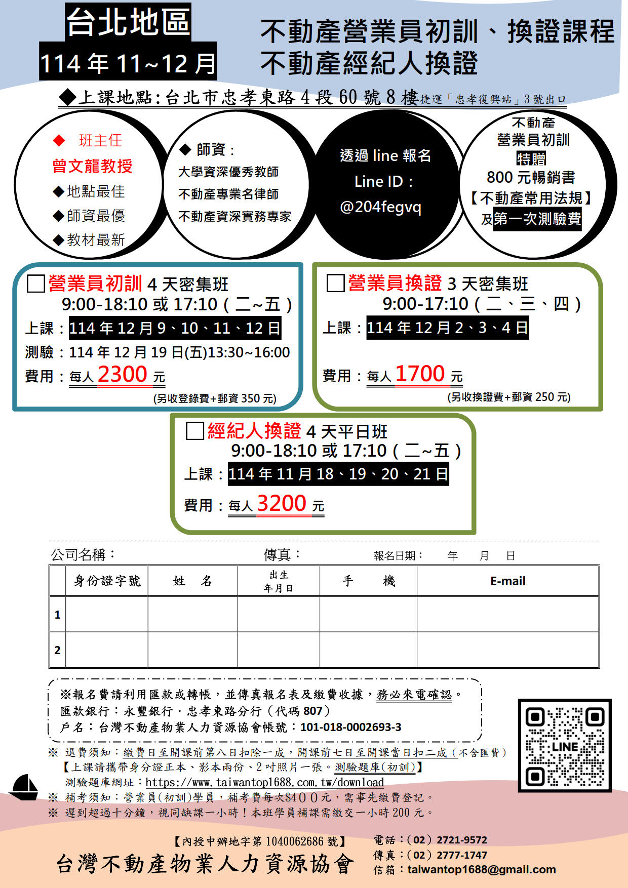 【台北區】不動產營業員《新訓》114.12.9~12◆12月19日測驗☆招生中☆