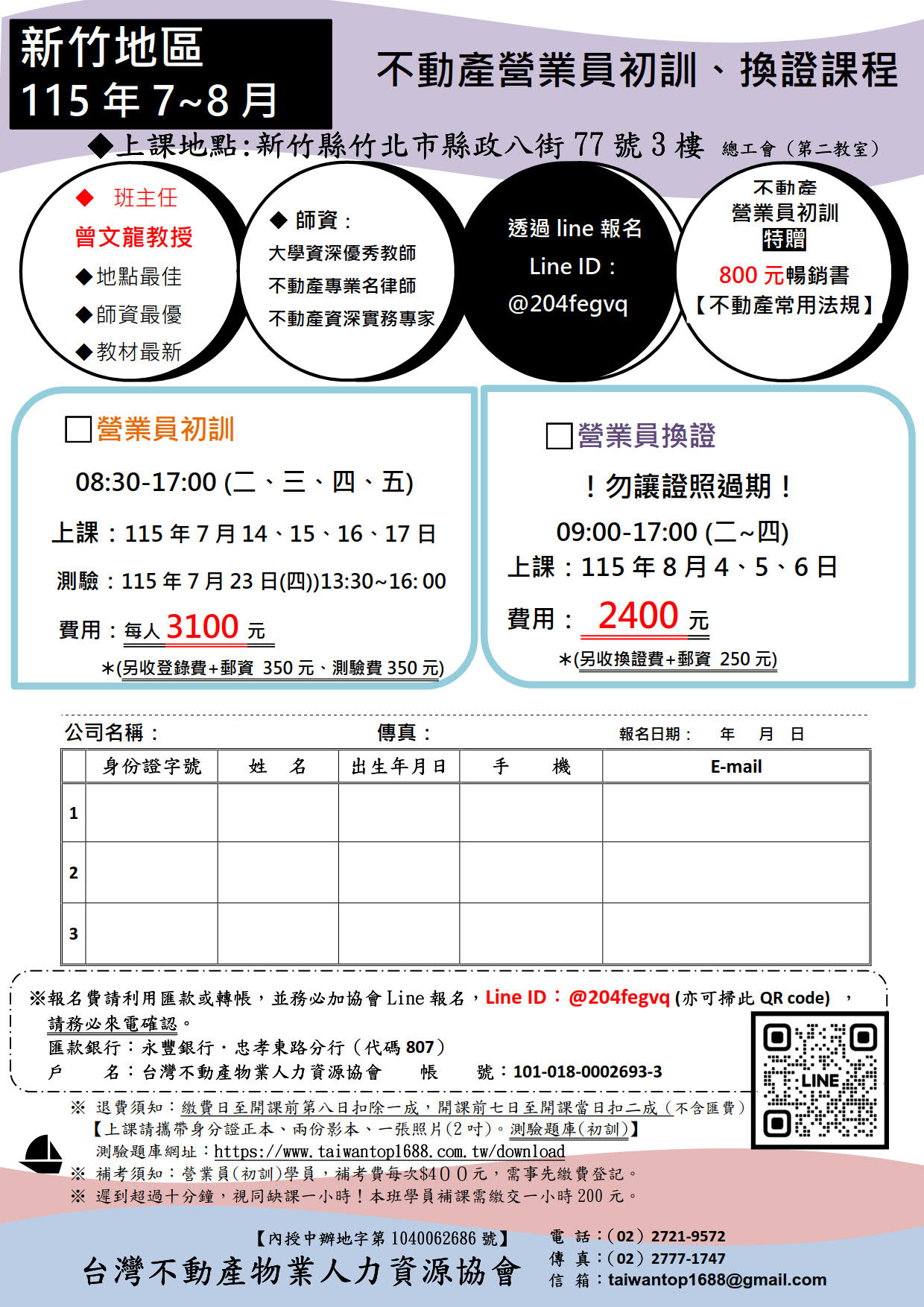 COURSES課程資訊 【新竹區】不動產營業員〈複訓〉《房屋仲介 換證》115年8月4~6日 date.2025.01.07 ★ 房仲 不動產營業員複訓 ★(仲介、房屋仲介、代銷 換證班) !勿讓證照過期 !上課:115年8月4、5、6日 9:00-17:00 (二~四)費用: 2400元 (另收換證費+郵資 250元) ☆歡迎介紹同事、朋友來上〈營業員新訓〉 新訓學員特送一本《曾文龍博士》暢銷書「不動產常用法規」 市價800元,非常實用的法條字典 聯絡電話:(02)2721-9572 LINE ID:@204fegvq ( https://lin.ee/mO3mmJN ) 上課地點: 新竹縣竹北市縣政八街77號3樓 《總工會‧第二教室》 ◇ 高鐵的免費接駁車,20分鐘一班,〈家樂福站〉下車,走路三分鐘到教室。 外縣市來的學員一定要做7:40這班接駁車,才不會遲到喔~ ◆另有台北危老重建推動師、新北市危老防災、新北市都市更新、地政士考照班、不動產經紀人考照班、 不動產估價師學分班、不動產估價師助理學分班、不動產估價師學分假日班等,歡迎詢問~~ back