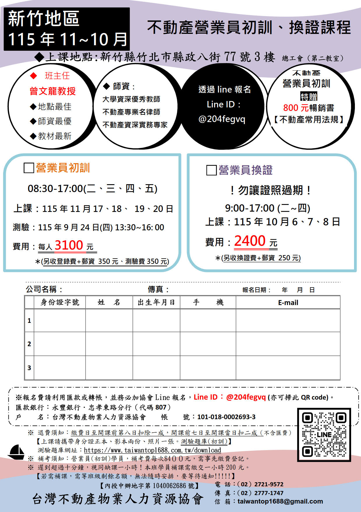 COURSES課程資訊 【新竹區】不動產營業員〈房仲複訓、換證〉10月6~8日 ★ 房仲 不動產營業員複訓 ★(仲介、房屋仲介、代銷 換證班) !勿讓證照過期 !上課:115年10月6、7、8日 9:00-17:00 (二~四)費用: 2400元 (另收換證費+郵資 250元) ☆歡迎介紹同事、朋友來上〈營業員新訓〉 新訓學員特送一本《曾文龍博士》暢銷書「不動產常用法規」 市價800元,非常實用的法條字典 聯絡電話:(02)2721-9572 LINE ID:@204fegvq ( https://lin.ee/mO3mmJN ) 上課地點: 新竹縣竹北市縣政八街77號3樓 《總工會‧第二教室》 ◇ 竹北高鐵站〈3號候車亭〉的免費接駁車,20分鐘一班,〈家樂福站〉下車,走路三分鐘到教室。 外縣市來的《換證》學員一定要搭8:00這班高鐵接駁車,才不會遲到喔~ (最好可搭提早一班接駁車,因有時會脫班,大部分不會脫班) ◇ 其餘地方,查詢「公車路線」,應該有更多選擇喔~ ◆另有「地政士考照班」、「不動產經紀人考照班」、「台北危老重建推動師」、「新北市危老防災」、「新北市都市更新」、 「不動產估價師學分班」、「不動產估價師助理學分班」、「不動產估價師學分 假日班」等,歡迎詢問~~ back