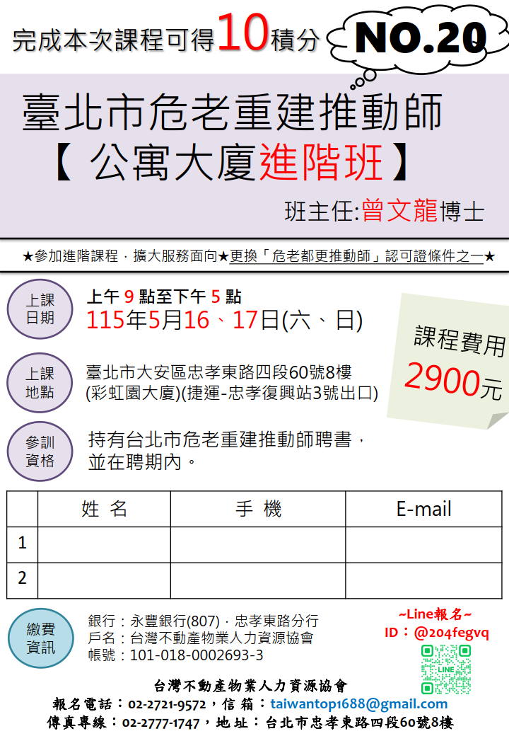 COURSES課程資訊 ★115年5月16、17日~臺北市危老重建推動師-公寓大廈進階班 date.2026.01.23 台北市危老重建推動師【公寓大廈進階班】 ★擴大商機、服務加值、獎勵加值★ ★完成本課程可取得輔導服務10積分★ ★更換「危老都更推動師」認可證條件之一★ 第十九梯次 上課日期|115年5月16、17日(六、日) 課程費用|2900元整(團報另有優惠) ※欲取得「台北市危老都更認可證」之推動師,請"務必"參加此課程。 ~歡迎加LINE或來電報名詢問~ 電話: (02)2721-9572 LINE ID : @204fegvq back
